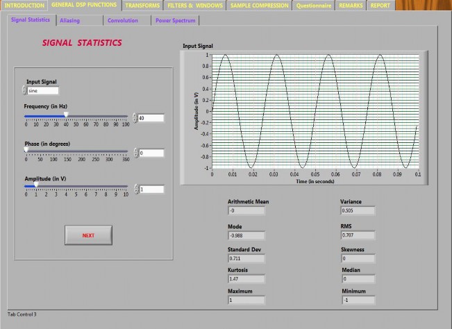 Note: There is a slight difference between the values obtained by mathematical calculation and those obtained by LabVIEW. This is because LabVIEW calculates the statistical parameters by taking discrete points in the signal, while mathematical calculation are done using equations of waveforms generated which are continuous in nature.